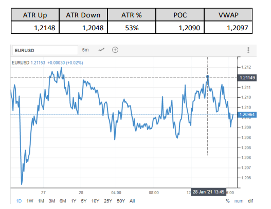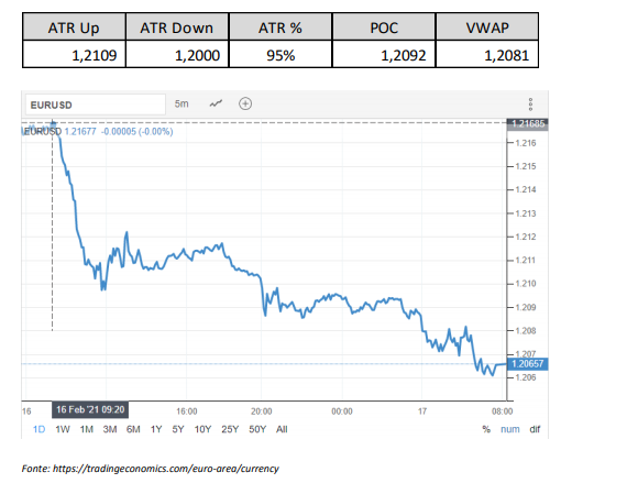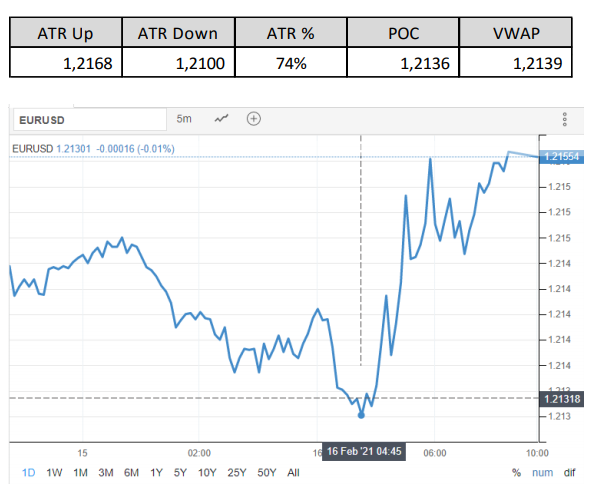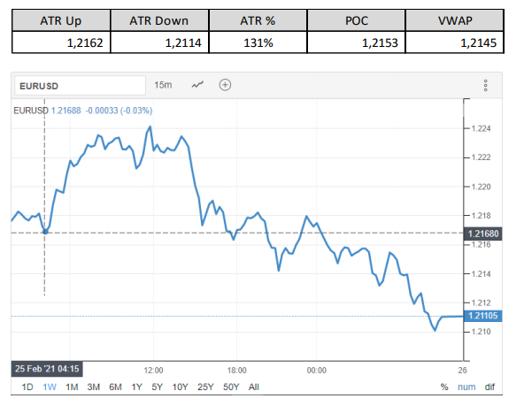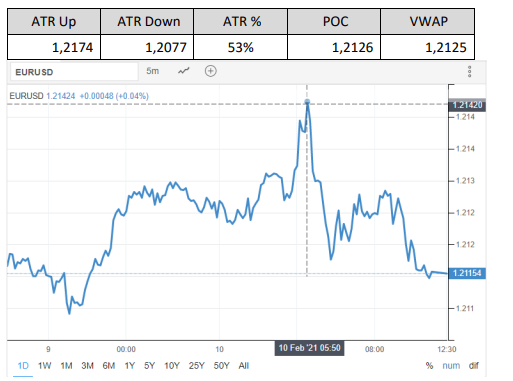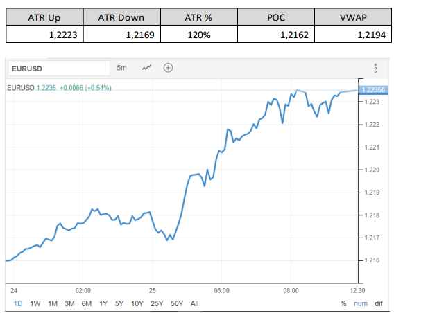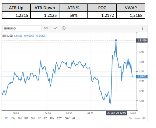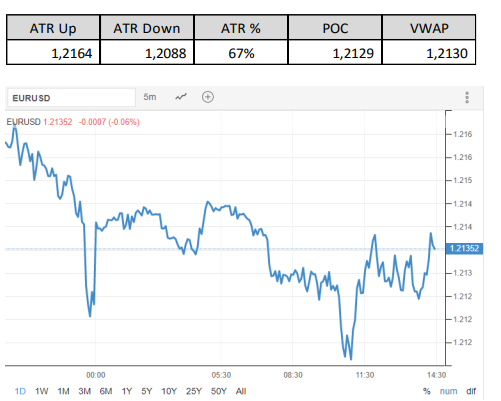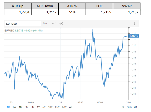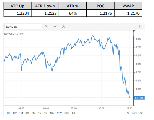In yesterday’s session, the EURUSD, which opened at 1.2155, closed with a soft fall of 0.04% at 1.2149, after reaching a high 1.2181 and a minimum of 1.2135. The day’s POC stood at 1.2148 and the VWAP at 1.2154. Today, the asset operates high, reaching the 1.2170 level twice, until 12:30 pm in London, before the opening of the North American market.