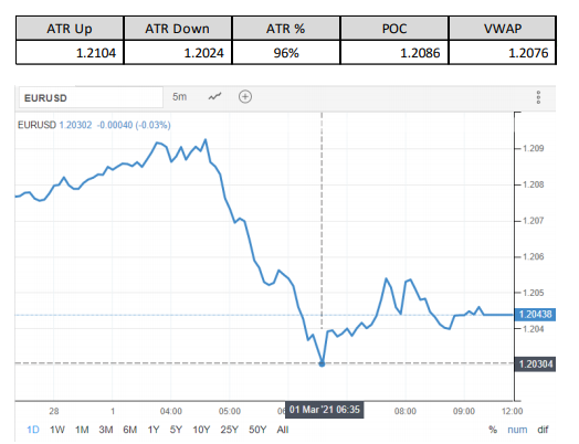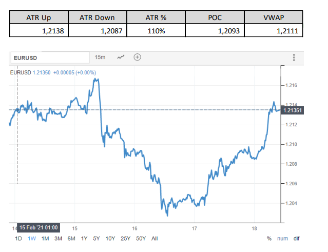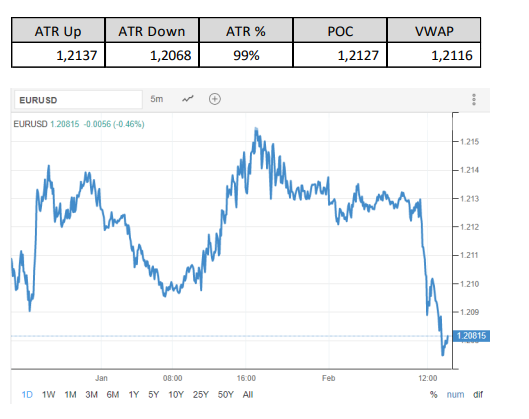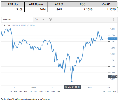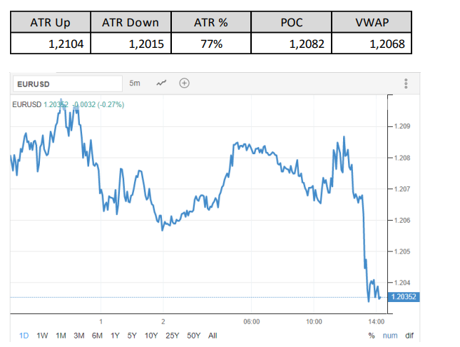 In the last part of yesterday’s session the EURUSD shot up, closing with a 0.35% appreciation at 1.2089. Today, after opening in1.2084, the EURUSD rose, reaching the level of 1.2112 on two occasions, but continues to oscillate around the POC and VWAP,close to 1.2086. Although the references indicate a probable drop in the value of EURUSD, in Payroll week the assettends to rise the day before and fall the day.