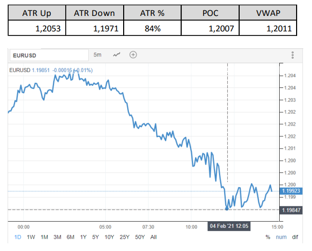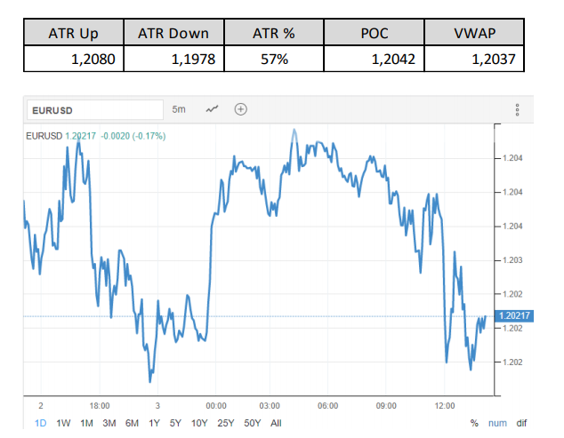 In yesterday’s session the EURUSD closed with a drop of 0.22%, very close to the POC, which was at 1.2042. Today, after openingin 1.2049, EURUSD fell to the level of 1.1994, from where it quickly returned to the POC and VWAP region, close to1.2020. Today, before the opening of the North American market, EURUSD was operating in a slight decline. Most of the referencesare close to 1.2020.