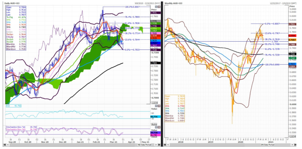 AUD / USD – Bears Fail Test Of Lower 30-D Bolli Resistance By 0.7530