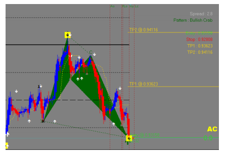 The Crab Harmonic Pattern is considered by some to be one of the most accurate patterns,allowing reversals very close to those indicated by fibonacci numbers. Ina bullish crab, point “B” will be a pullback between 0.382 and 0.618 of the leg “XA”. “BC”it should be a retraction between 0.382 and 0.886 of the AB leg. CD is an extension between 2,618 and3,618 of the AB leg. Point D is a 1.618 extension of XA.