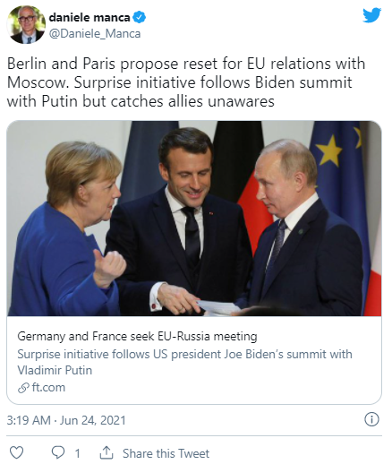 The day prior a report in FT cited EU diplomatic insiders who said that “Germany believes that the Biden-Putin summit provides a template for restoring relations with Russia.”